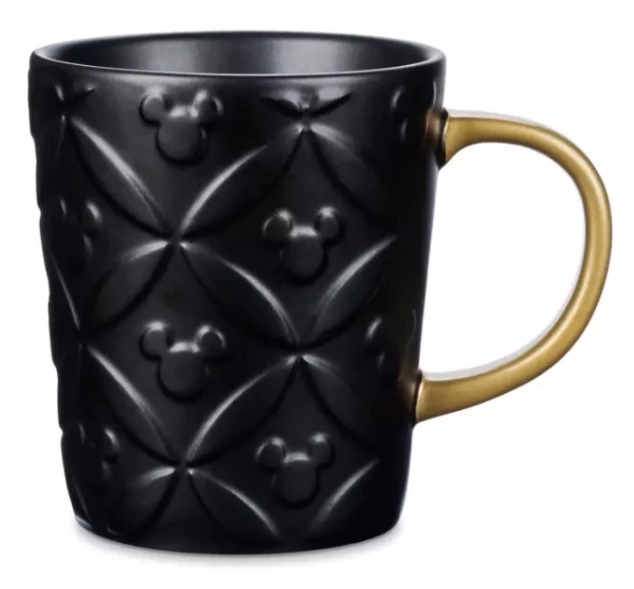 Enjoy your morning coffee or tea on your Disney Homestead mug with this classic black colored mug covered in raised Mickey icons, and gold handle.