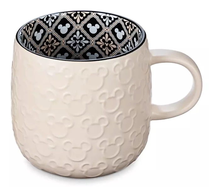 Enjoy life on your Disney Homestead while sipping something delicious from this classic mug covered in raised Mickey icons, and filled with a filigree and Mickey icon pattern inside.