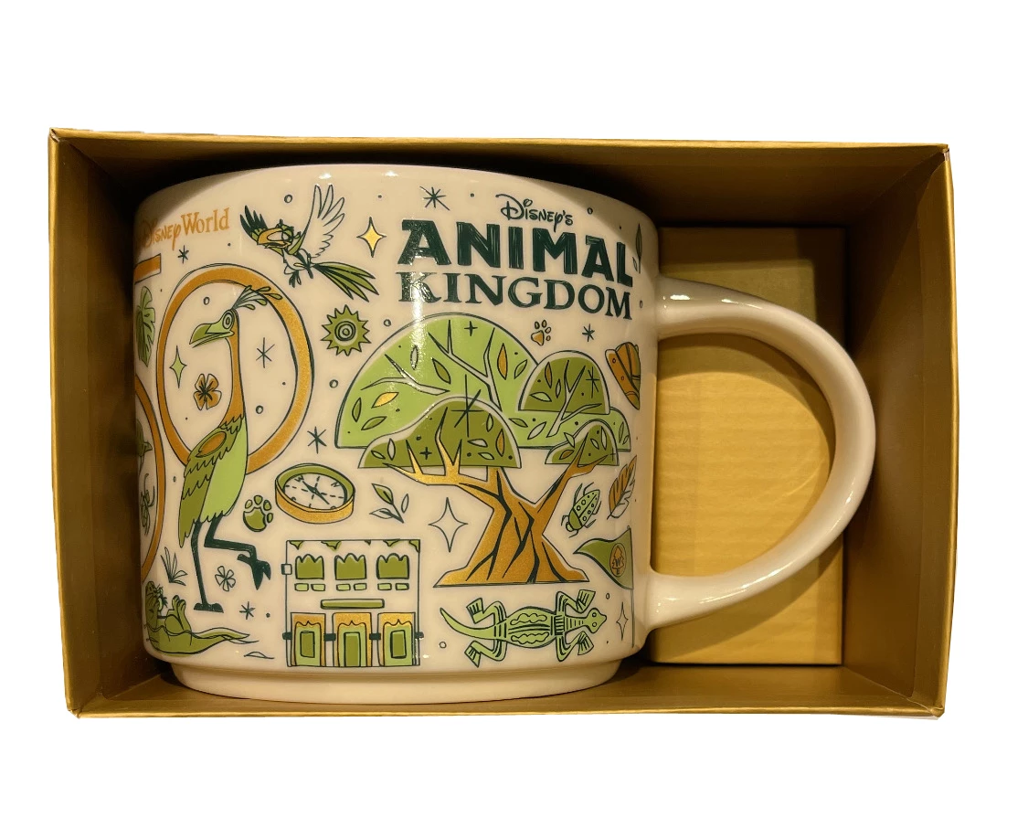 Starbucks and Animal Kingdom join together with Walt Disney World 50th Anniversary on this fun mug. Features the Starbucks Been There Series and surrounded by Animal Kingdom Icons, and 50th Logo.