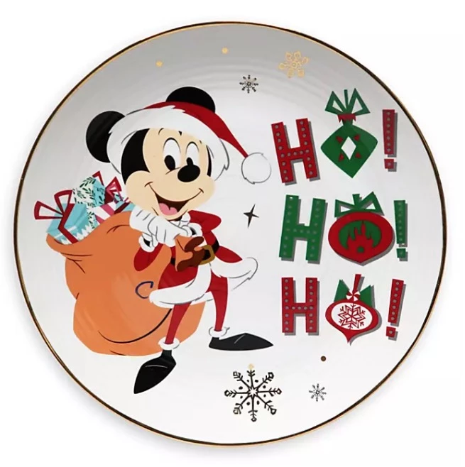 Santa Mickey has come bearing gifts on this festive dessert plate featuring a colorful ”Ho! Ho! Ho!” and gold snowflake accents. This jolly scene is as sweet as the desserts you place on this ceramic dish.