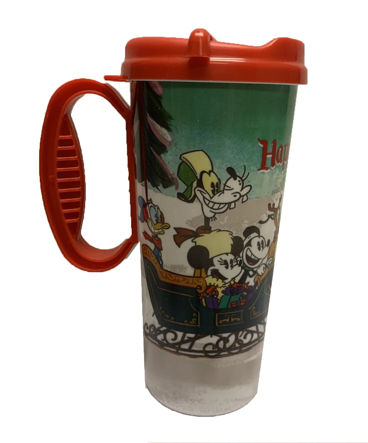 This fun refillable resort travel mug features a Happy Holidays Mickey and Friends in a festive design.ย