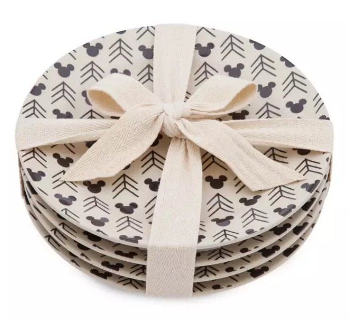 Add an elegant accent to your dinner table dΓ©cor with these ceramic plates from our Disney Homestead Collection. Each plate features a pattern of Mickey icons and the set comes stacked and tied with a cloth ribbon.