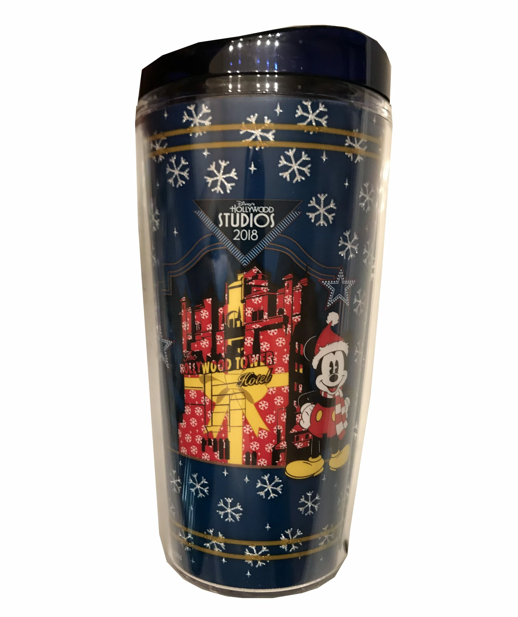 This is a Hollywood Studios 2018 Flurry of Fun Travel Tumbler, with Mickey and the Hollywood Tower Hotel.