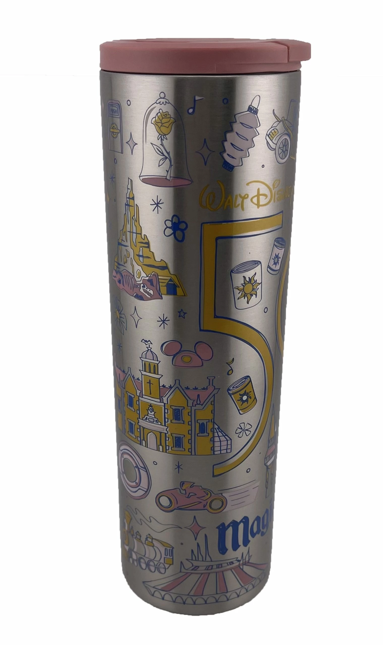 This Starbucks Been There Series Magic Kingdom Tumbler,ย Features 50th Anniversary Logos and Magic Kingdom Icons with a Pop up lid and in Stainless Steel.ย