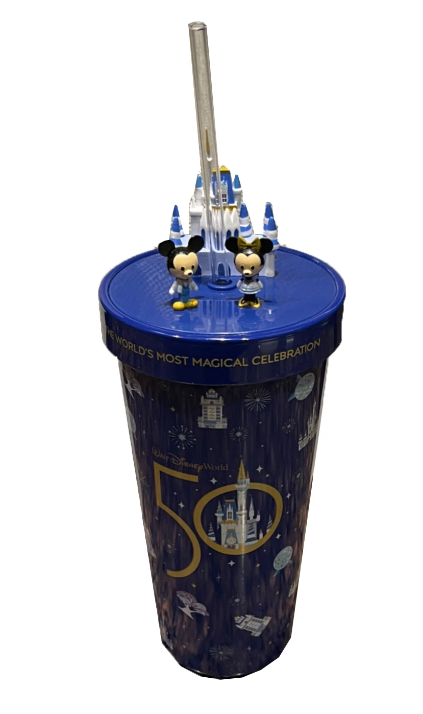 Celebration Walt Disney World 50th Anniversary with this Stainless Steel Tumbler with Straw. Features Fireworks, 4 Park Icons, The 50th Logo, and a figural Mickey and Minnie Mouse on top with Castle.