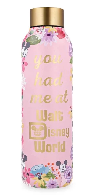 Who needs convincing to carry along this souvenir stainless steel water bottle with floral Mickey Mouse pattern and golden accents? You had me at “Walt Disney World.”